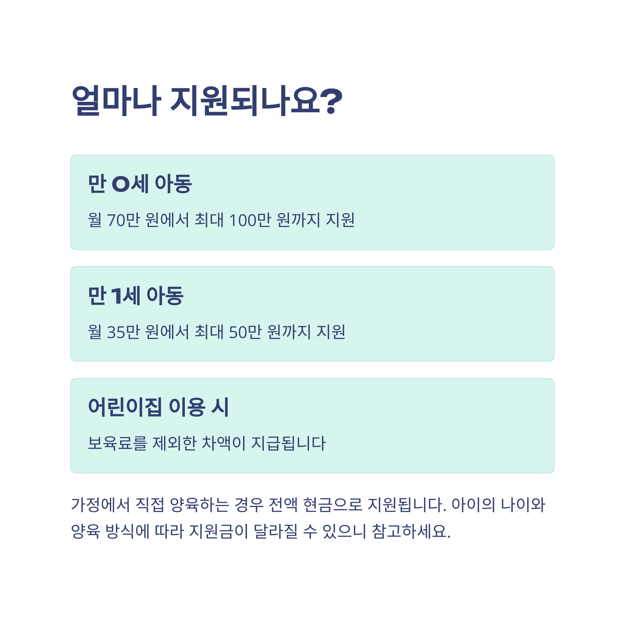 - 지급 기준은 실제 양육 여부와 이용 기관에 따라 변동