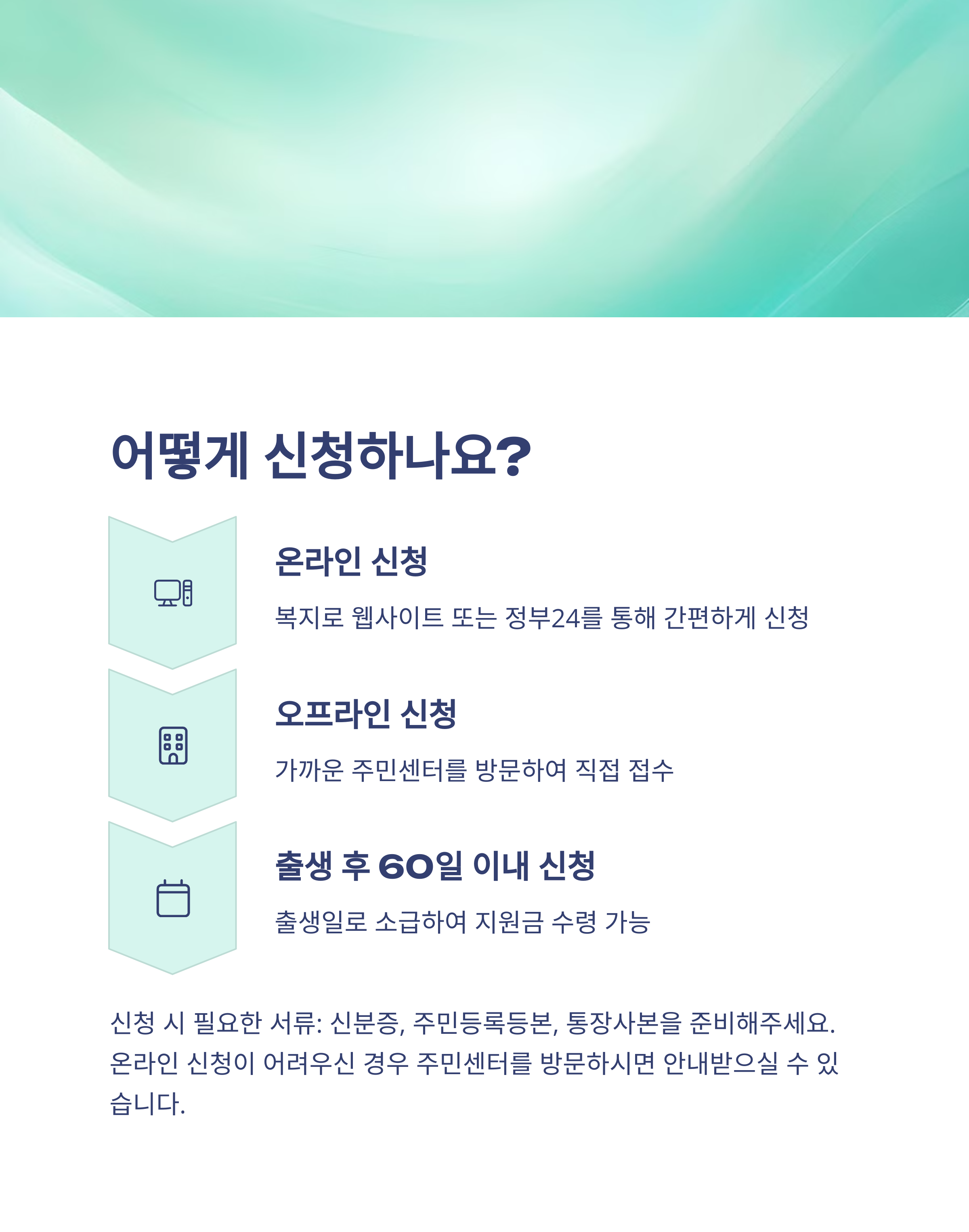 출생일 포함 60일 이내 신청 시, 출생월부터 소급하여 급여가 지급됩니다. 이후 신청하면 신청한 달부터 지급이 시작됩니다.