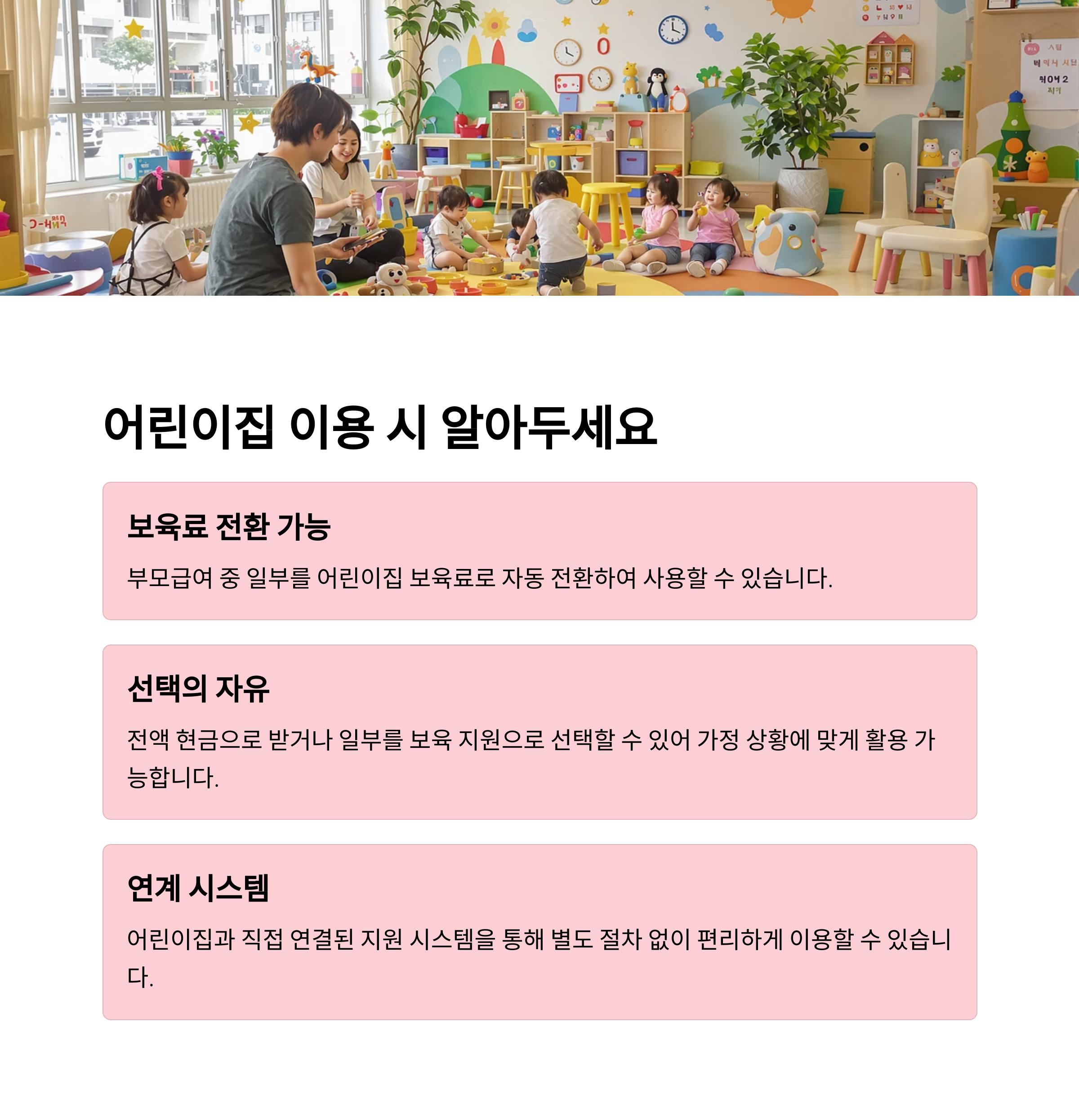 어린이집에 다니는 아동은 부모급여가 전액 현금이 아닌 보육료+현금으로 나뉘어 지급돼요.
