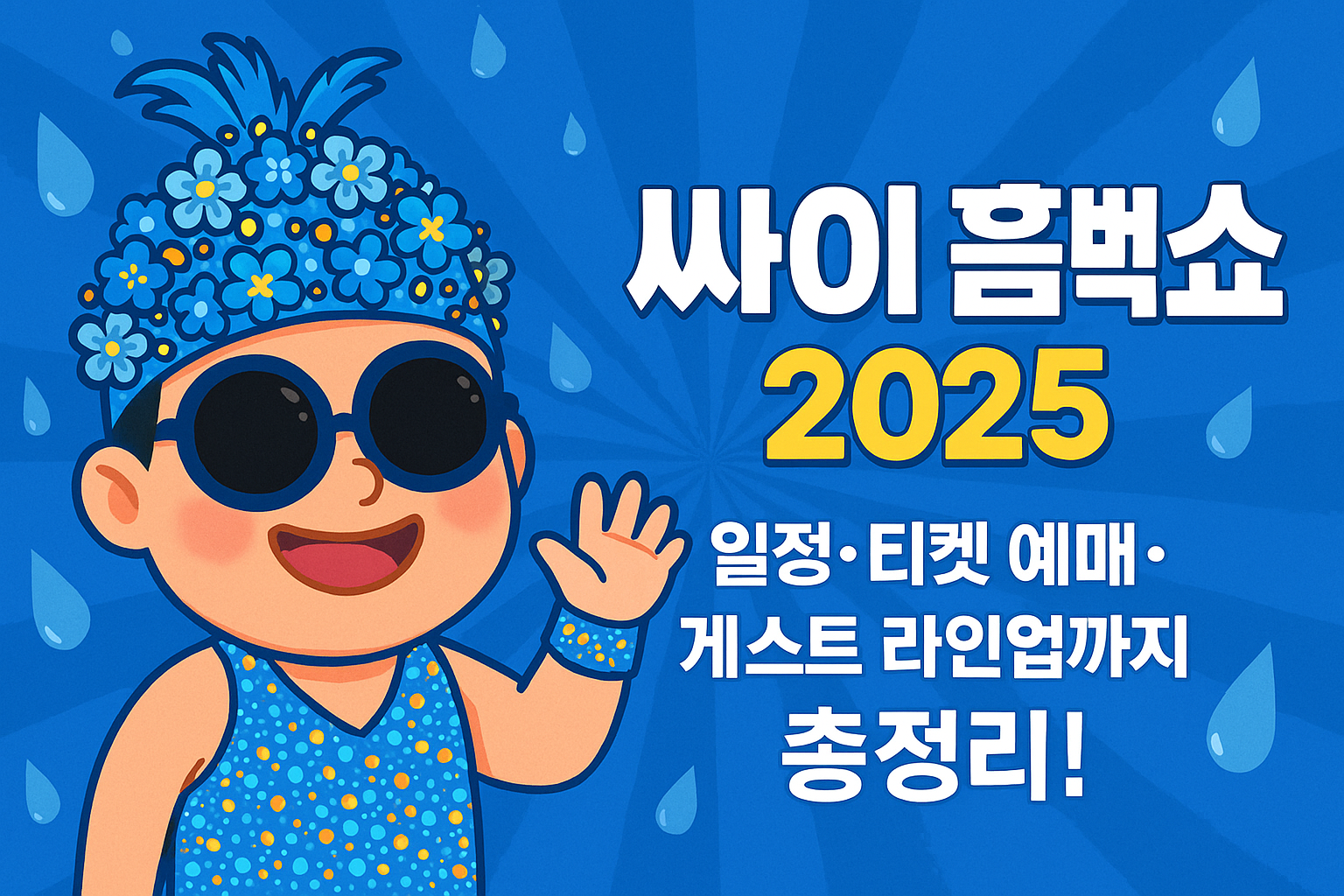싸이 흠뻑쇼는 매년 여름, 가수 싸이가 전국을 돌며 열정을 쏟아내는 대한민국 대표 여름 공연입니다. 싸이 흠뻑쇼는 수만 리터의 물세례, 온몸으로 즐기는 떼창, 화려한 퍼포먼스까지! 2025년에도 어김없이 돌아온 싸이 흠뻑쇼는 더 강력한 무대와 에너지로 팬들의 여름을 시원하게 만들어 줄 예정입니다.