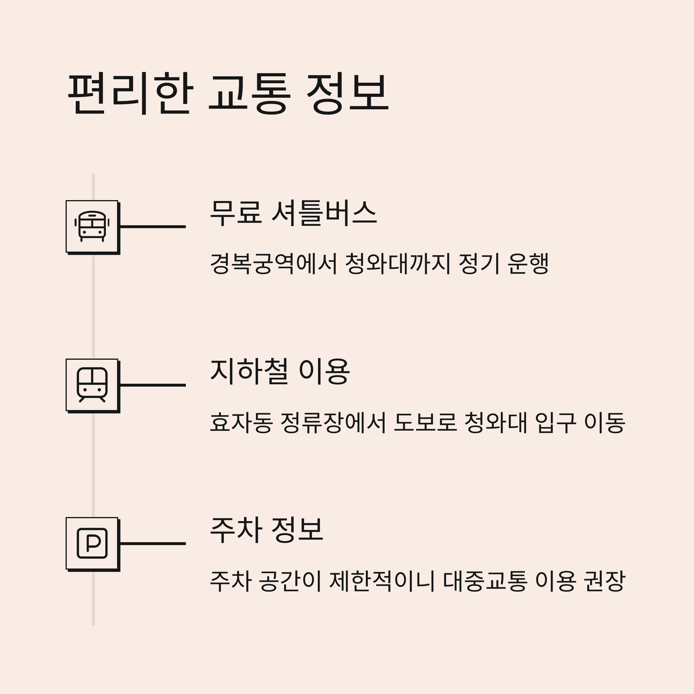 - 🚌 금~일, 공휴일 무료 셔틀버스 운행 (광화문 ↔ 청와대)