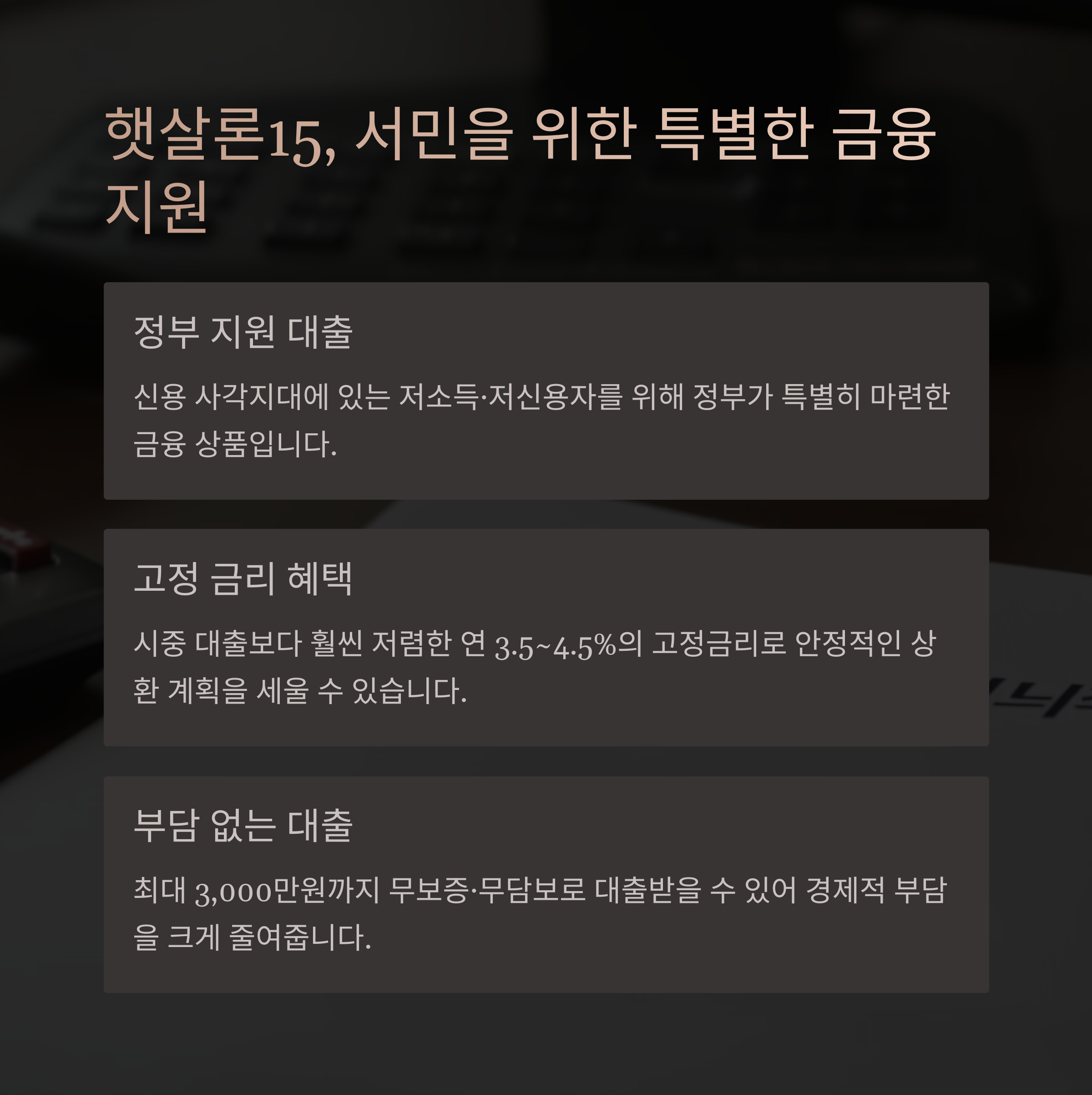 햇살론15는 금융 사각지대를 위한 정부 대출로, ✔️ 자격 요건만 충족하면 무보증, 저금리로 이용 가능하며, ✔️ 서민금융진흥원 앱 또는 홈페이지에서 손쉽게 신청할 수 있습니다.
