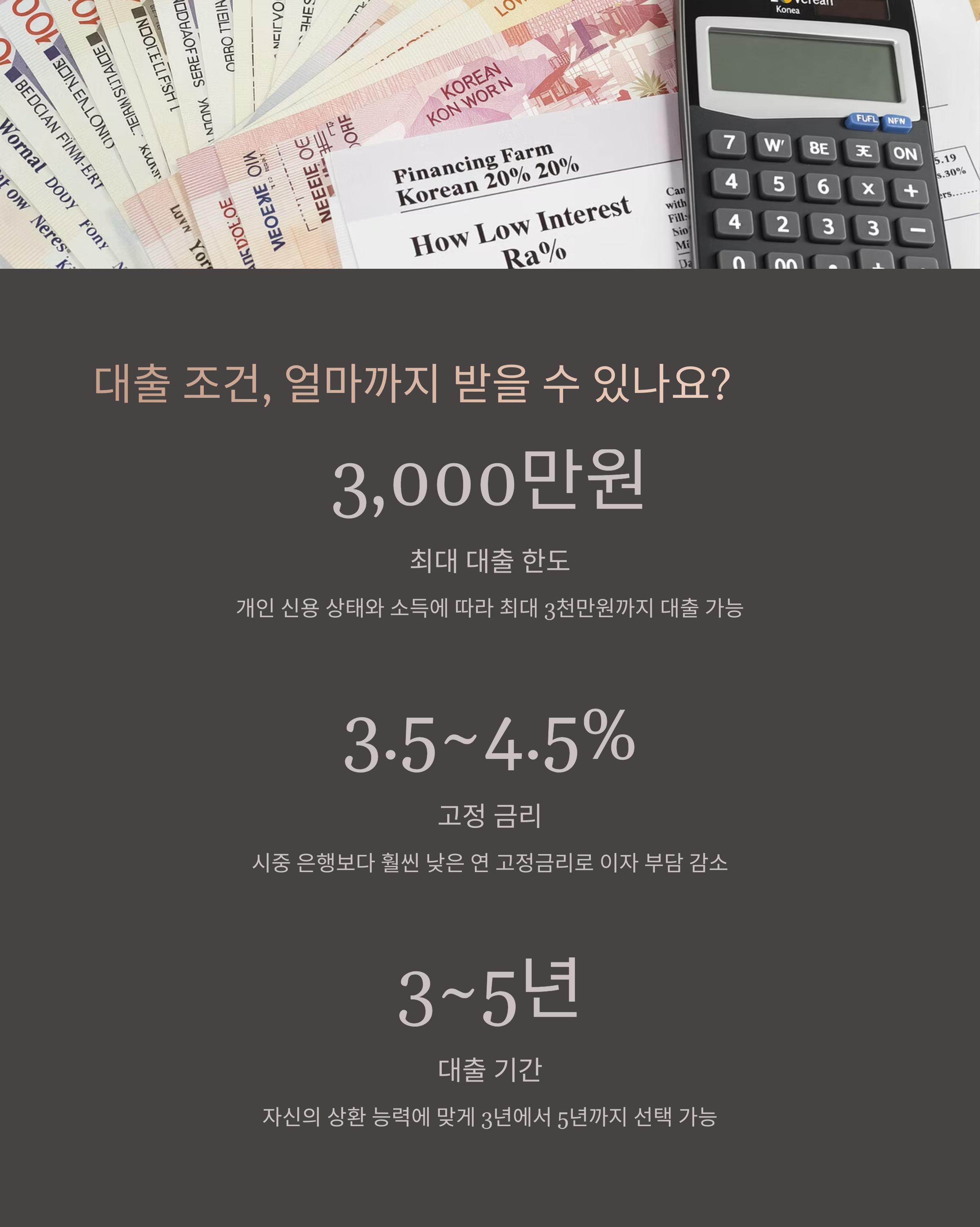 2025년 기준으로 최대 3,000만 원, 연 3.5~4.5% 고정금리로 이용할 수 있어요.