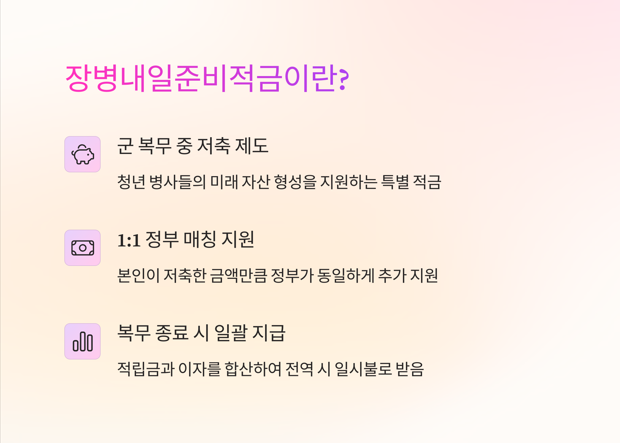 단순한 적금이 아니라, 전역 후 인생 첫 자산을 마련하는 국가 지원 목돈 만들기 프로그램이라고 볼 수 있어요.