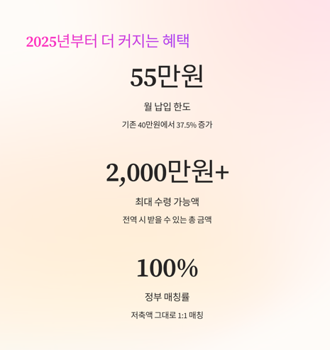 - ✅ 월 납입 한도: 40만 원 → 55만 원