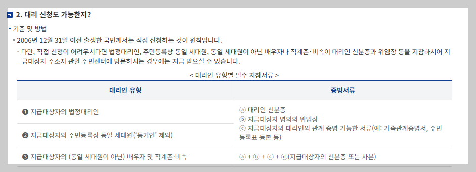 | 세대원, 배우자, 직계존비속 | 위 서류 + 지급 대상자 신분증 또는 사본 |